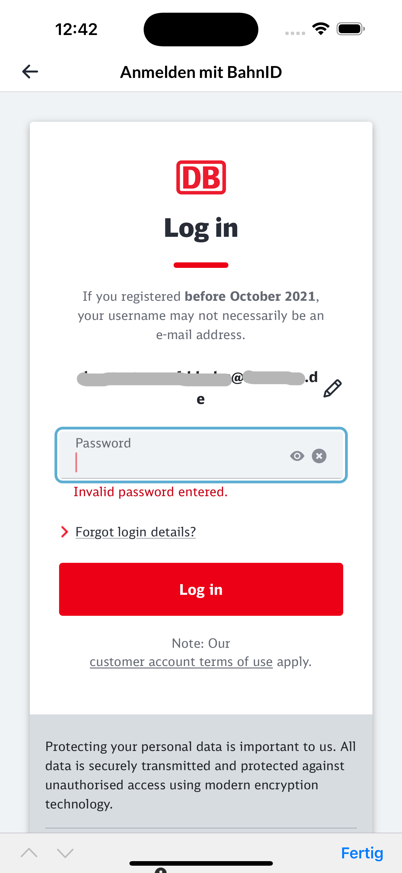 Möglicherweise nutzen Sie das falsche Passwort. Falls Sie bei bahn.de/DB Navigator die gleiche E-Mail-Adresse verwenden, wurden diese Accounts seit der Umstellung von BahnID auf das DB Kundenkonto mit dem Bonvoyo Login verbunden, sodass Sie sich mit Ihrem bahn.de/DB Navigator Passwort anmelden können. Falls Sie keinen bahn.de/DB Navigator Account haben oder einen dort eine anderen E-Mail Adresse verwenden, versuchen Sie (hier) ihr Passwort zurückzusetzen.