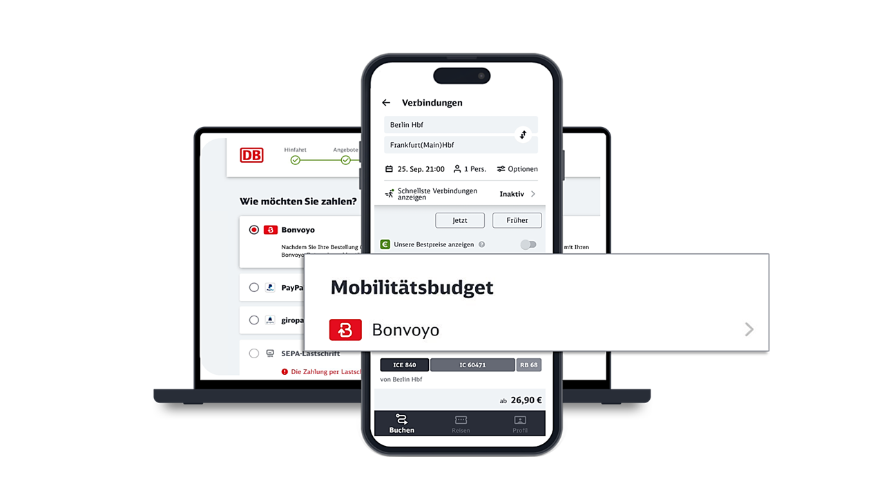 Der Bonvoyo-Button ist im DB Navigator und auf www.Bahn.de integriert. Bei der Buchung von Fahrten für den Fernverkehr oder den öffentlichen Nahverkehr (Bahn, Bus, Tram etc.) kann über den Bonvoyo-Button bezahlt und über das Mobilitätsbudget abgerechnet werden.