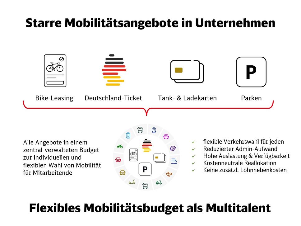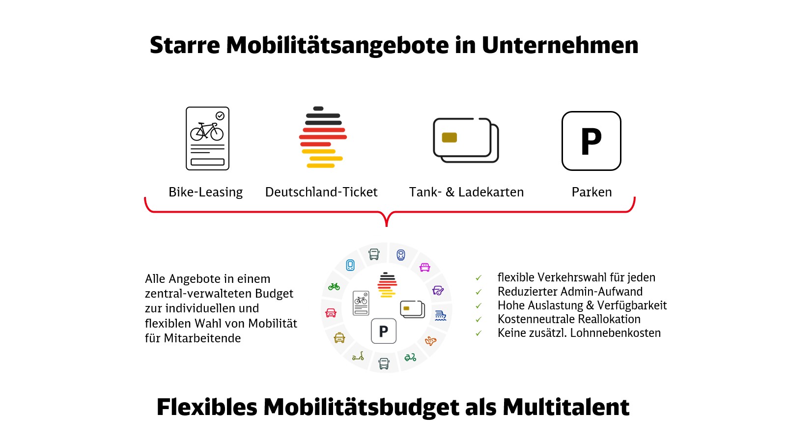 Der Unterschied zur klassischen Bereitstellung von Deutschlandticket, Firmenrad & Co.: Unternehmen müssen nicht mehr für jedes Angebot eigene Prozesse und Verträge pflegen. Stattdessen laufen alle Mobilitätsformen in einem gemeinsamen Budgetrahmen zusammen. Egal, ob Deutschlandticket, Jobticket, Firmenrad, E-Bike, Tanken, Laden, Car- oder Bike-Sharing.Statt ‚entweder-oder‘ gilt nun ‚sowohl-als-auch‘ in der Mobilität für moderne Unternehmen.Und das alles in nur einem integrierten System. Statt viele einzelne Mobilitätsbenefits zu verwalten, können Unternehmen nun den Rahmen gestalten, innerhalb dessen die Mitarbeitenden bedarfsgerecht, situationsabhängig und individuell Mobilität wählen. Das senkt Aufwand, Kosten und Komplexität und eröffnet neue Chancen für zeitgemäße Unternehmensmobilität.
